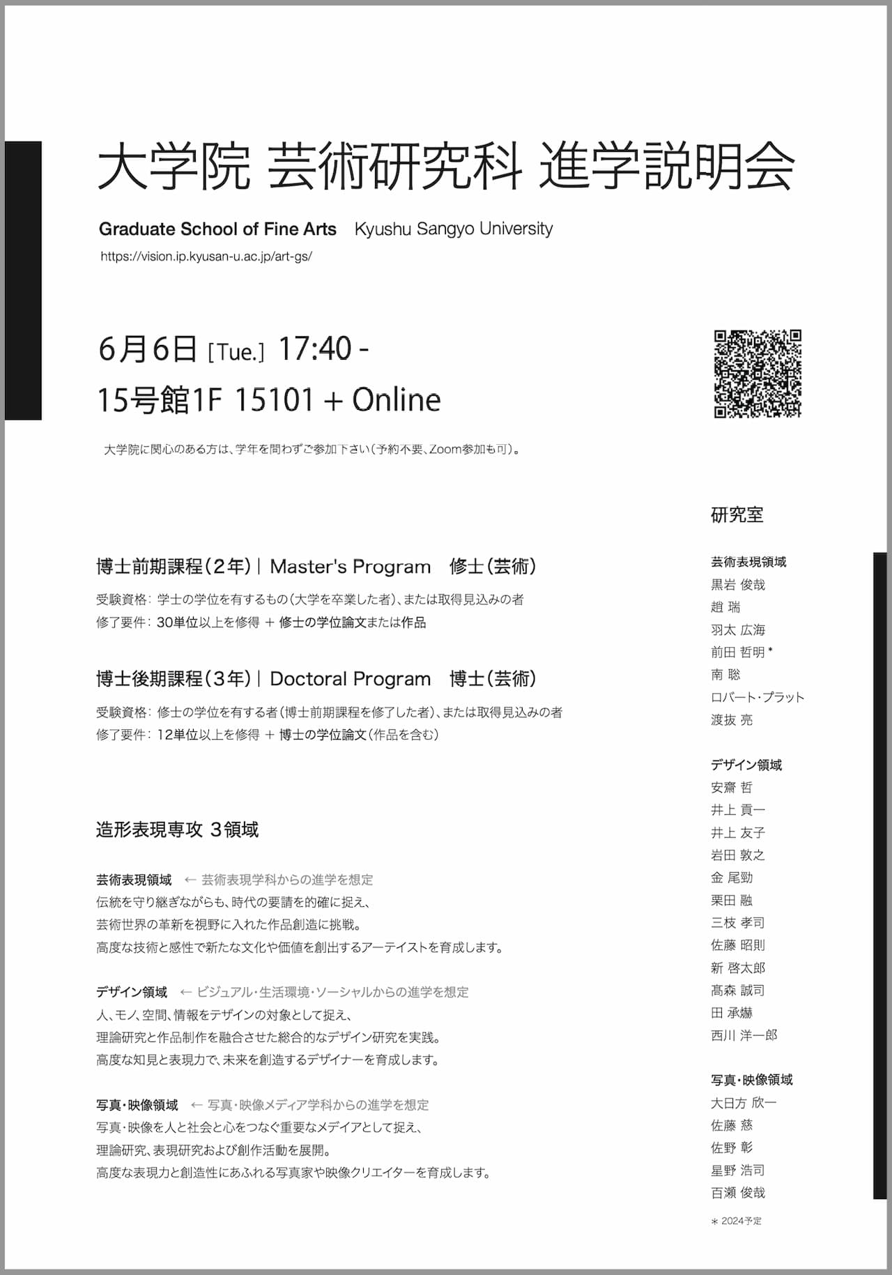 - 選抜方法:口述試験(研究計画書と持参作品にもとづいて面接)