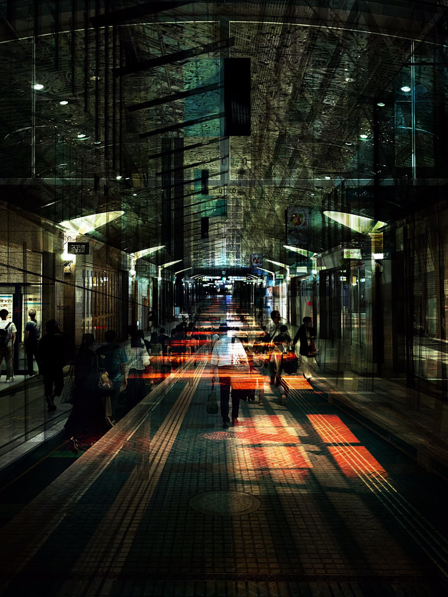 時間軸や空間軸の異なる画像を重ねることで、被写体の時間と空間を曖昧にする。「いつ、どこで撮影されたものなのか?」が曖昧な中で、構図の情報のみが明確な状態を作り出す。採用する構図は放射線構図であり、これは中心に向かって奥行きを強く感じさせる構図である。見方によっては、時間と空間が奥へと無限に続くような感覚に陥る。