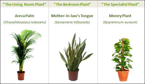 シンノウヤシ, アレカヤシ, チャメドレア・セフリジー(テーブルヤシ), カンノンチク, バナナ, コヤブラン, コチョウラン, デンドロビウム, オリヅルラン, セイヨウタマシダ, ネフロピス・オブリテラータ, アフリカセンボンヤリ(ガーベラ), セイヨウキヅタ, スパテイフィラム属, サンセベリア, ベニフクリンセンネンボク, キク, ポトス, アンスリウム・アンドレアナム, アグラオネマ属, フィロデンドロン オオウバユリ, ヒトデカズラ, フィロデンドロン ドメスティカム, ドラセナ・フラグランス, ベンジャミン, ゴムノキ, ディフェンバキア, ホマロメナ・ヴァリシー, アロエベラ