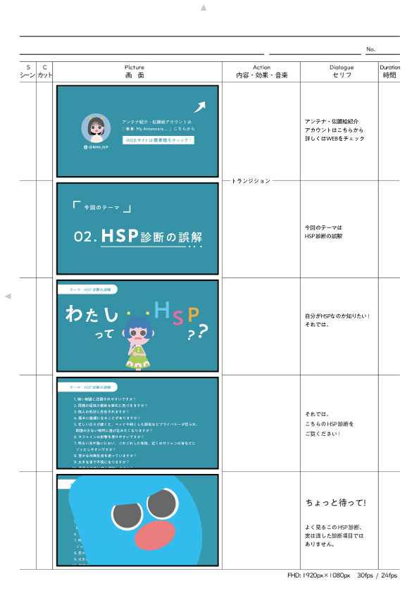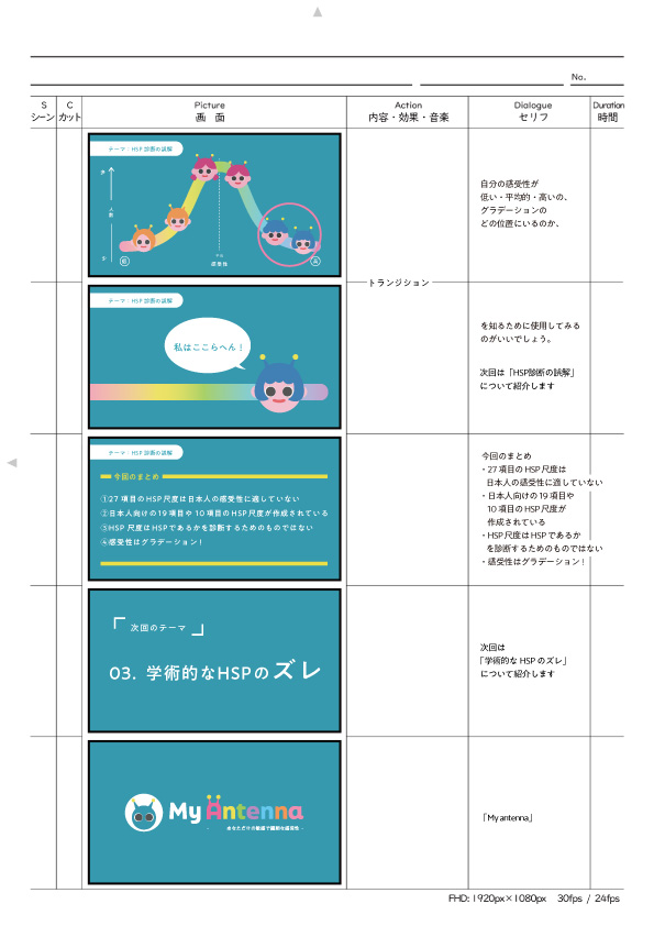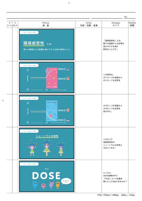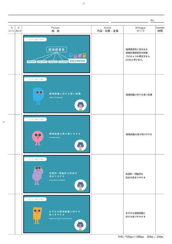 インターネット上でのHSPコンテンツによって誤解が広まっていることから、本研究ではWEBやSNSを積極的に活用する。現在、インターネット上で公開されているHSPに関連する情報は、主に文字に偏っており、多くの情報を直感的に理解することが難しい状況である。そのため、本研究では動的なインフォグラフィックス表現を採用し、情報を視覚的に可視化することに重点を置く。文字だけでは伝わりにくい情報をビジュアルによって分かりやすく表現し、印象に残りやすく体系的なコンテンツによる情報発信を目指す。HSPに関する効果的な情報を発信していくため、また、HSPに対して好意的な印象を与えるために、柔らかで親しみやすいキャラクターのイラストレーションを活用する。これらにより、HSPに対する理解と共感を促し、ポジティブな関心を喚起することが期待できる。