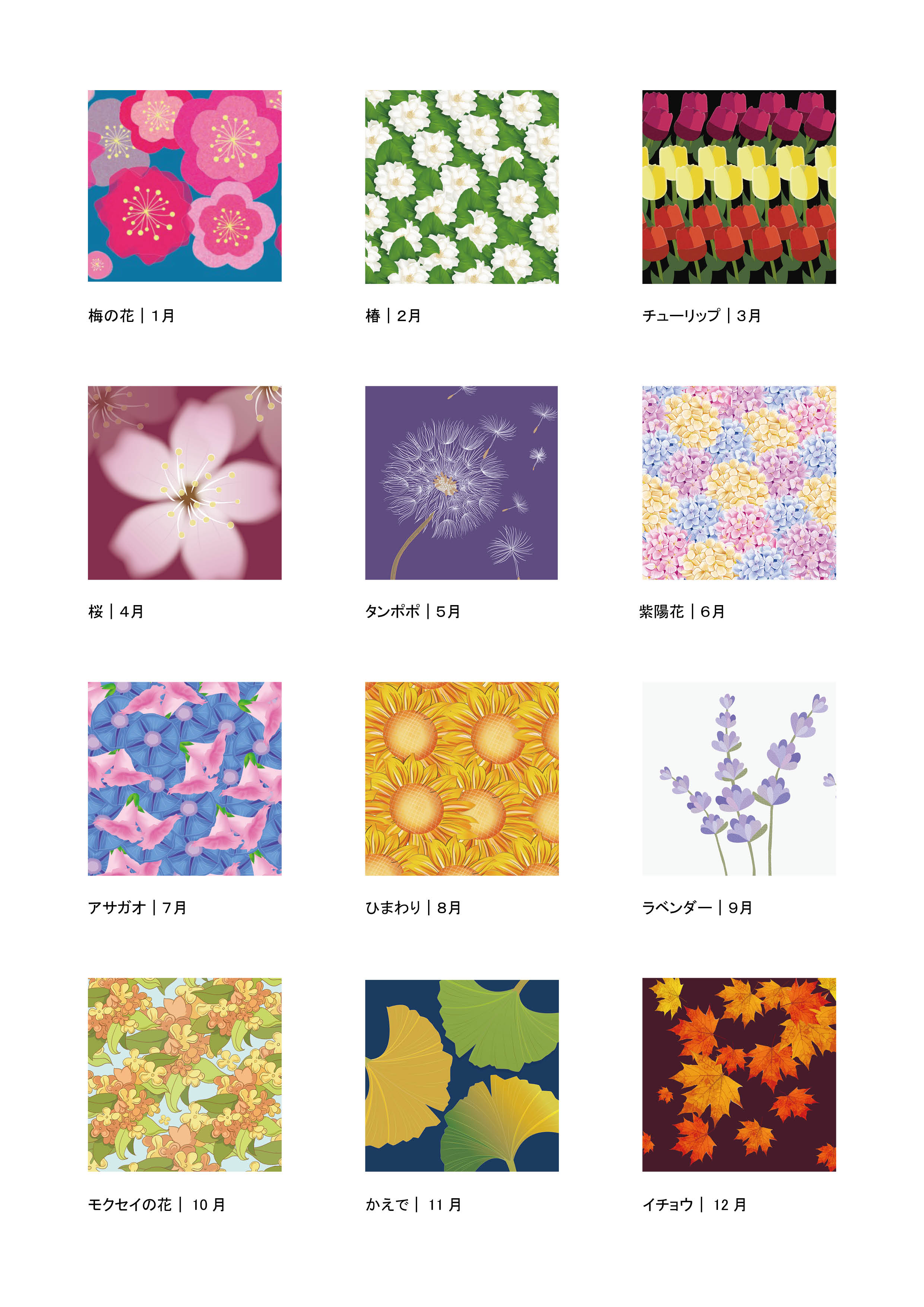 12ヶ月の代表的な植物、動的パターンが出現し期待感を増加させる演出を行う。代表的な植物は以下のとおり。