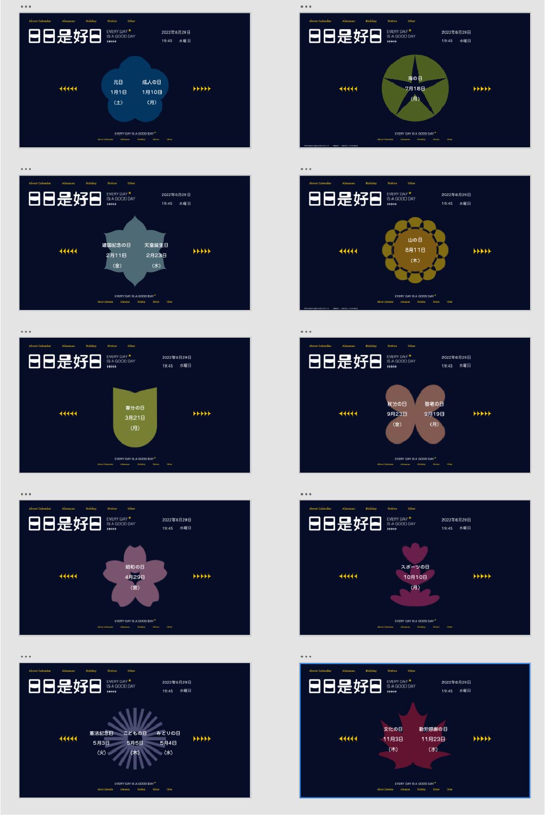 「日日是好日」のテーマに沿って、カレンダーにかかわる情報の整理、イラスト、様式の編成を行った上、ウェブの研究および設計報告書の作成を進めた。詳しくは下記のようである。
