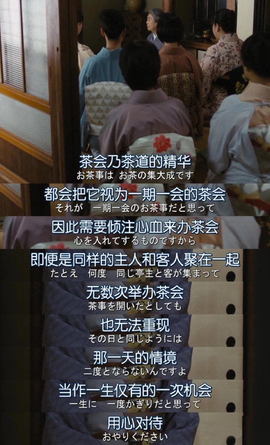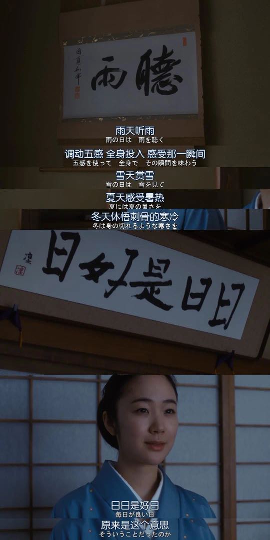 映画に出てきている四季の変化、節気の変動、風ないし雨の音という二十四節の変化にともなって物語が推進されてきたのである。「日日是好日」がかけてある武田先生の和式茶室は和式美学を反映している極端的な表現である。時下は永久であり、日々を有意義に過ごすことは極めて重要である。