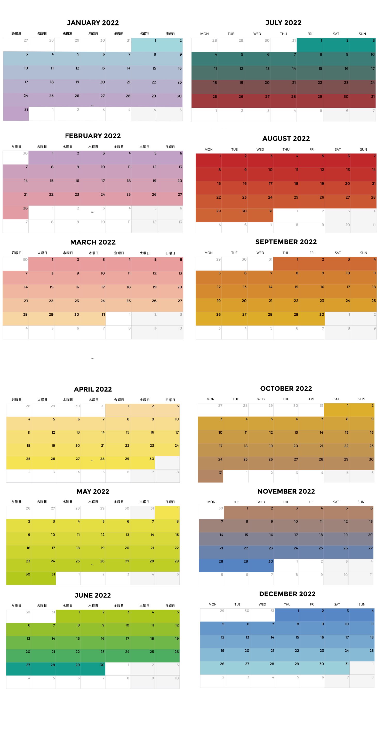 - 週→日: 52週365日:毎週毎日の色が含まれている。