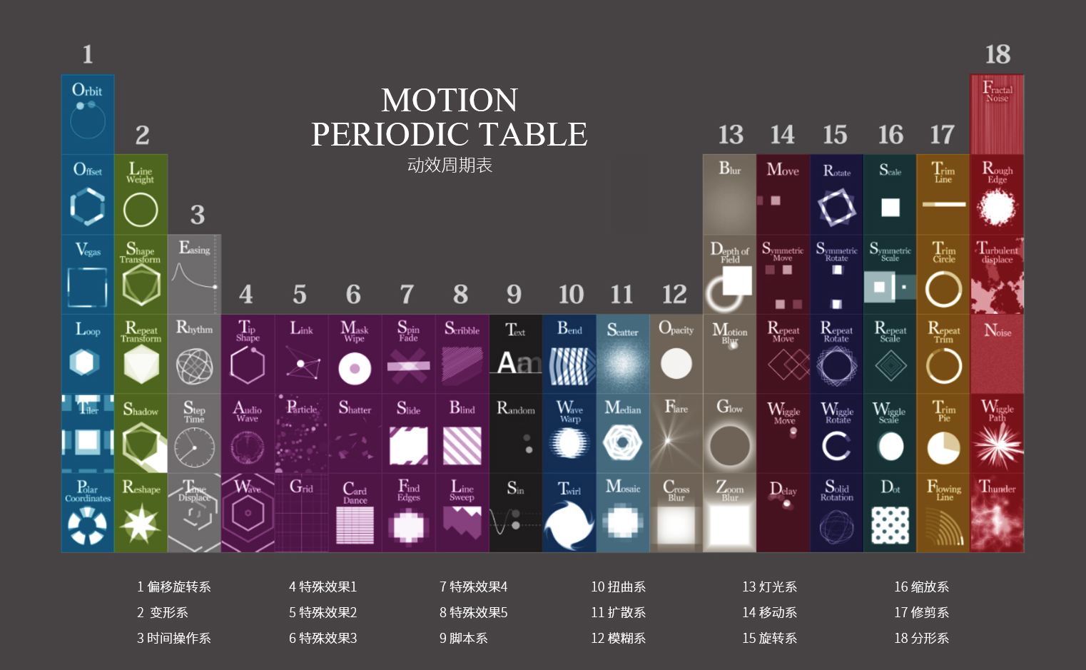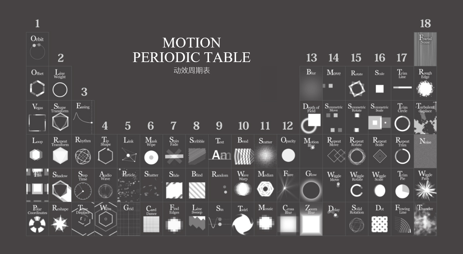 モーションの「元素」とでも言える(いえる)ようなものを知っていれば、理解し、作ることもできる。そこで、モーショングラフィックスを学び、理解し、作りたい人のために、このモーション周期表を作成した。